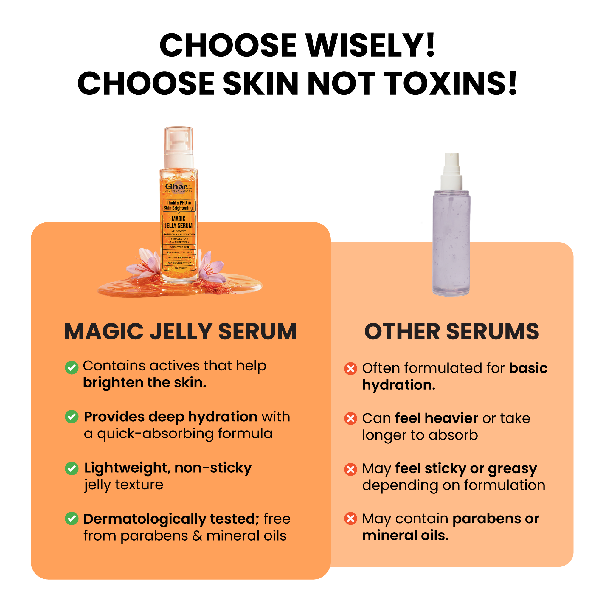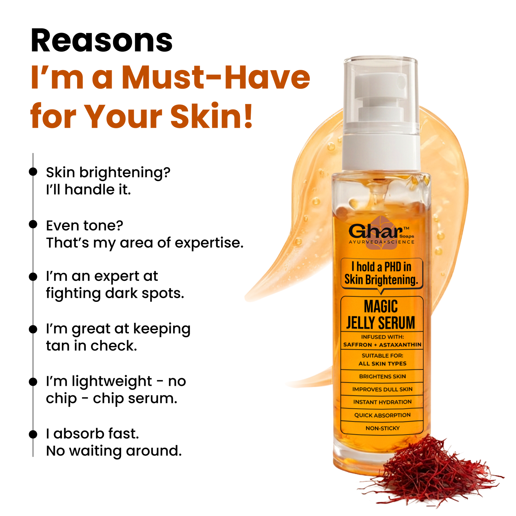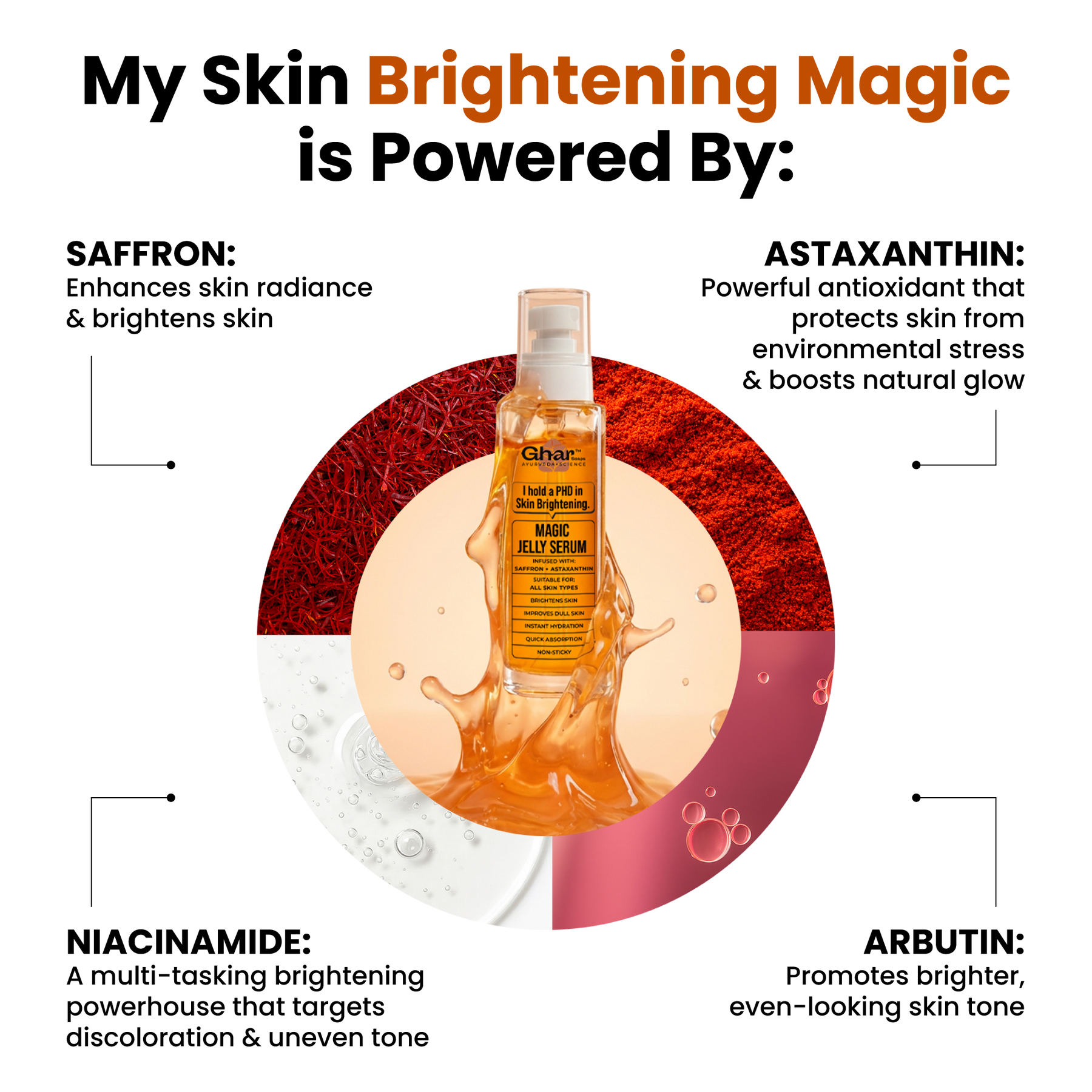 I’m India’s first Magic Jelly Serum, holding magic to brighten your skin with actives like Saffron, Astaxanthin, and Niacinamide, specially designed to help reduce dark spots and uneven skin tone.