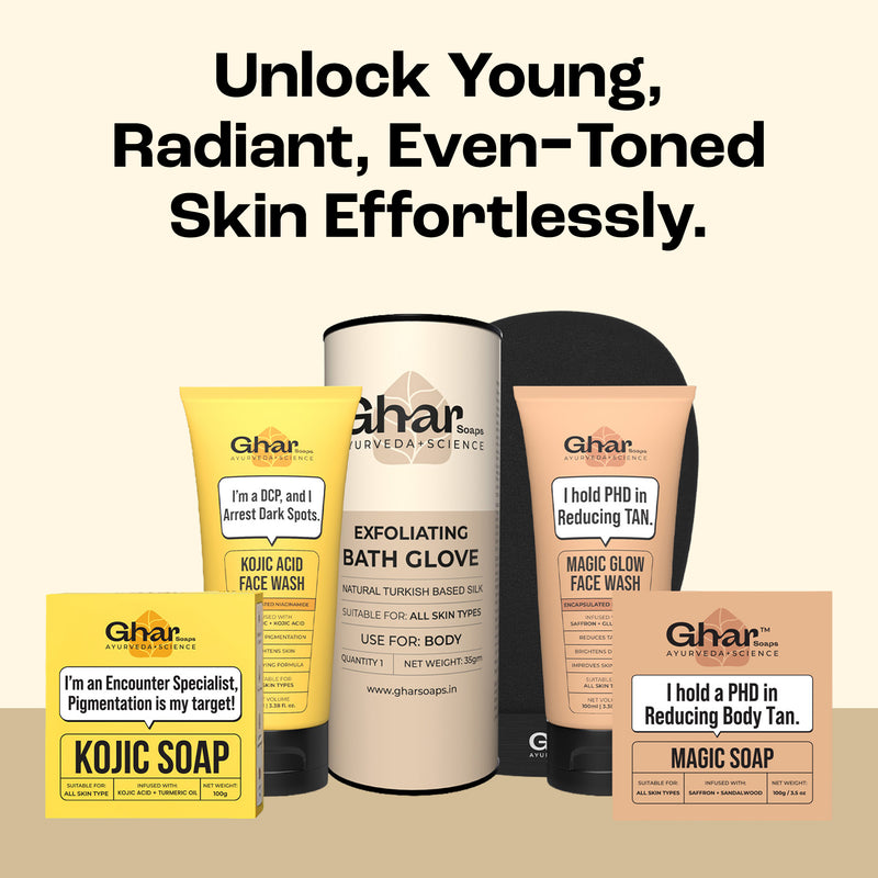 Ready for brighter, softer, spot-free skin? The Trio of Magic Soap, Kojic Soap, and an Exfoliating Bath Glove fights tan, dark spots, and dull & Dead Skin, revealing your best glow yet!