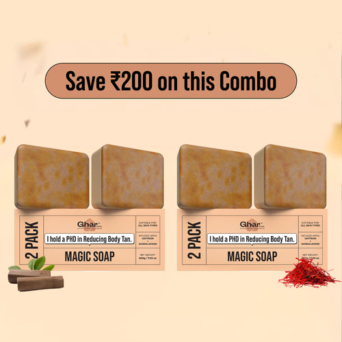 Get glowing skin with our Magic Soap Combo made with Saffron, Sandalwood, and Kojic Acid that helps reduce tan and brighten your skin. Buy a Pack of 2 and get a Magic Cream free, go for Pack of 3 or 6 and get a Magic Cream plus Magic Sunscreen free. The more you buy, the more freebies you get – perfect for keeping your skin healthy and glowing every day!