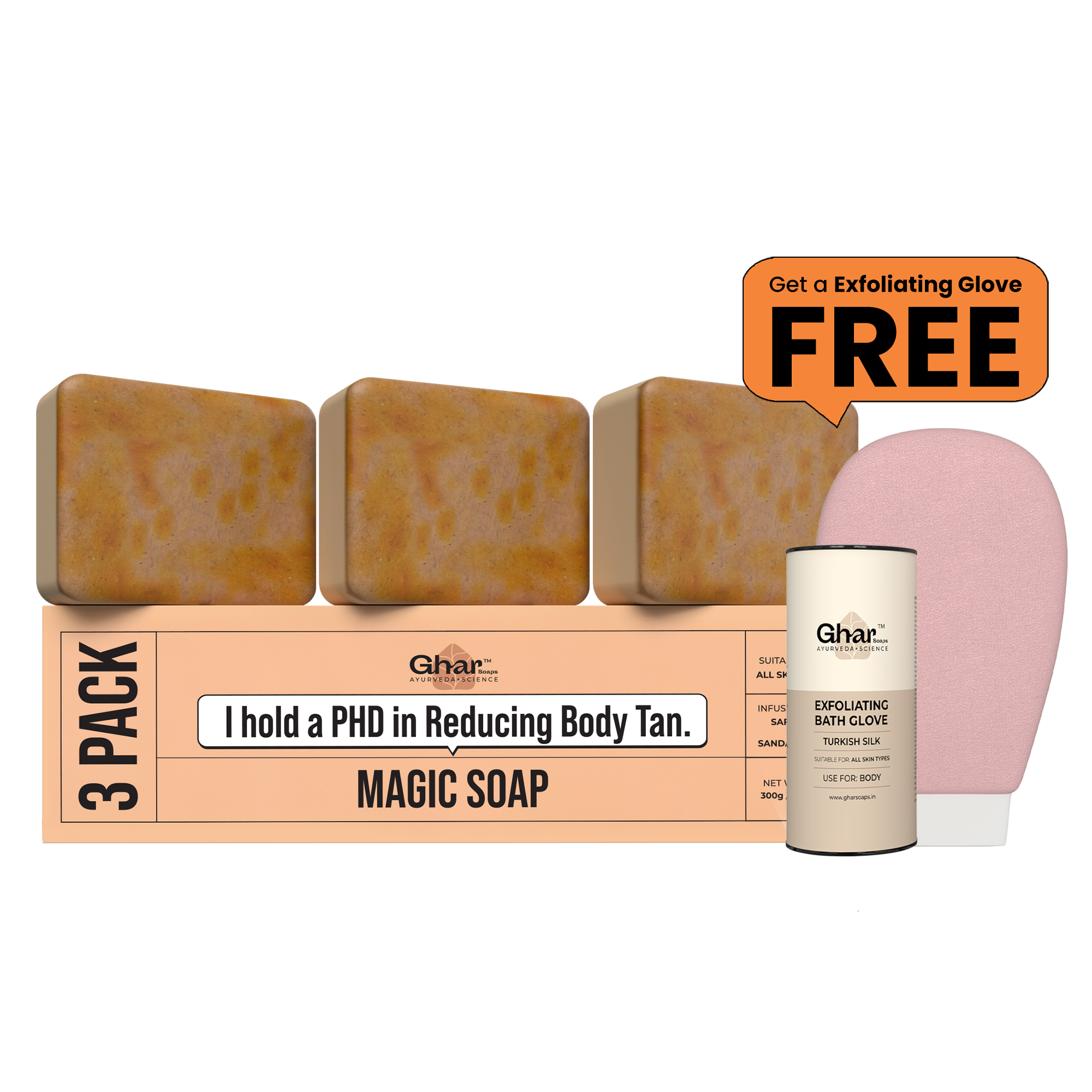 Free exfoliating Body Glove + Pack of 3 Magic Soap